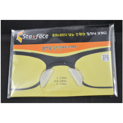 材料選用高質進口柔軟矽膠,採用先進工藝製作而成,佩戴時防滑舒適、不易發黃,耐久性和耐腐蝕性能更好,具不易發黃變色等優點,鼻貼與皮膚表面接觸能使鏡架不易滑動。目前,市面各種品牌板材眼鏡架都趨向於大框大弧度設計;鼻貼能很好的解決喜歡佩戴板材眼鏡架但又苦於鼻樑不高或鼻樑不寬無法托起眼鏡的煩惱。